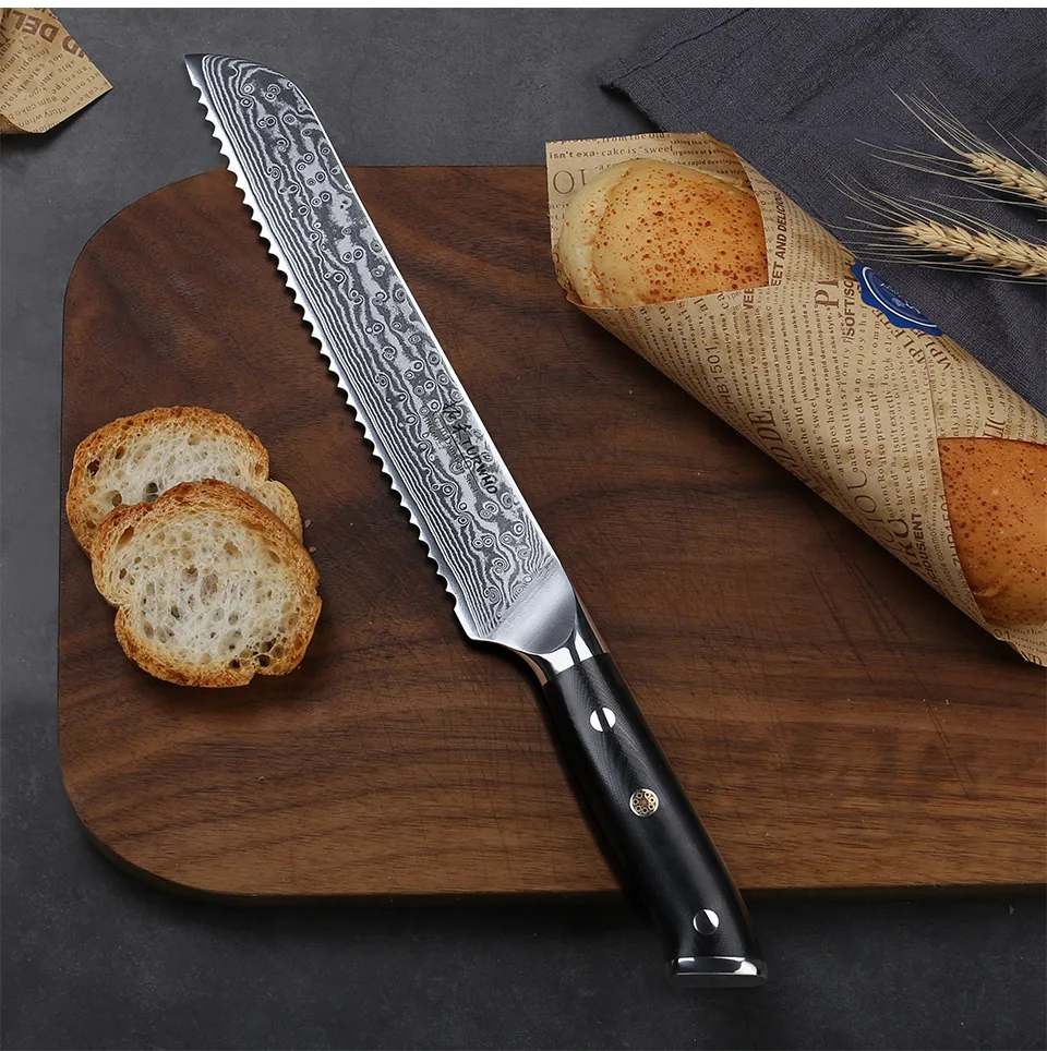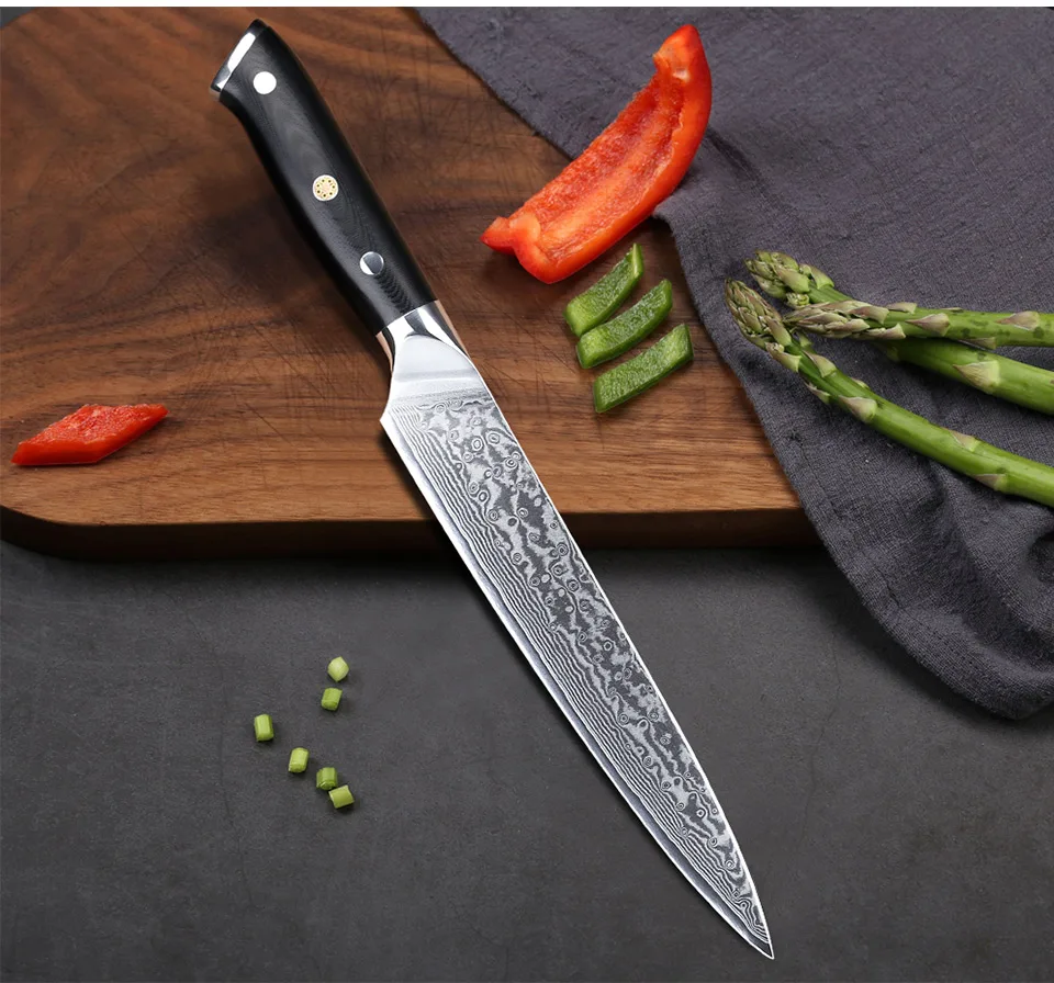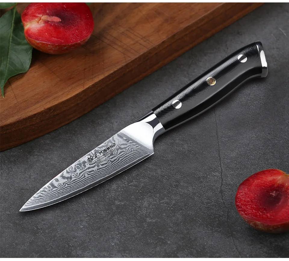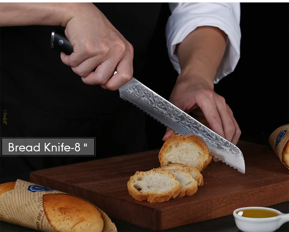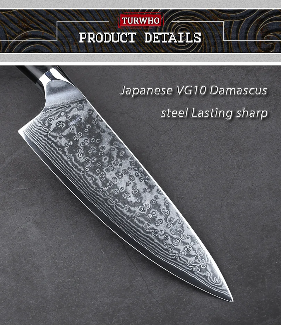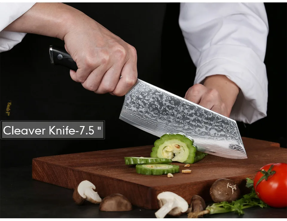 Характеристики набора ножей: * 3,5-дюймовый нож для очистки овощей Ножи * 5-дюймовый Утилита Ножи * 7-дюймовый Santoku Ножи * 7,5 дюймов Тесак * Гироборд с колесами 8 дюймов хлеб Ножи * Гироборд с колесами 8 дюймов нарезки Ножи * 8-дюймовый кухонный Ножи Материал лезвия:67 слоев Дамасская супер сталь Материал ручки:Тройная заклепочная Ручка G10Твердость сердечника:60 ± 2 HRC Угол края:15 градусов одна сторона Обработка поверхности:Полировальная обработка, высококачественный внешний вид Характеристики:Острый и прочный, супер антикоррозийный светильник Уровень резкости:Уровень силы резания: 6,0-8,0 N международные стандарты. Упаковка:Красивая подарочная коробка.