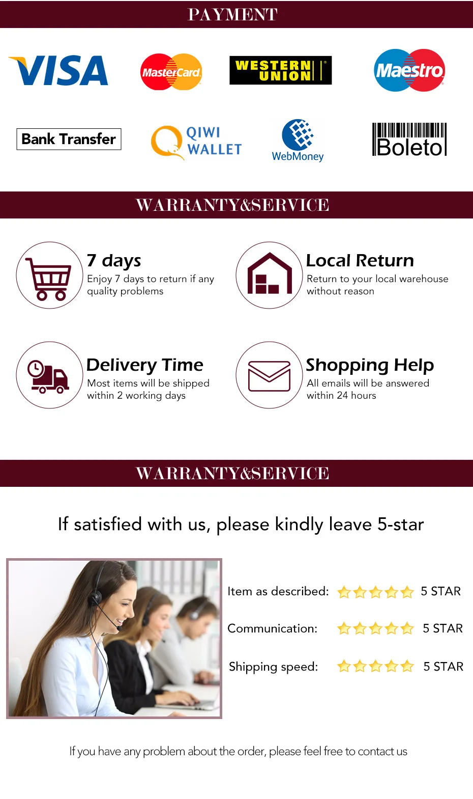 1. Возврат принимается. Пожалуйста, свяжитесь с нами Перед возвратом товаров.