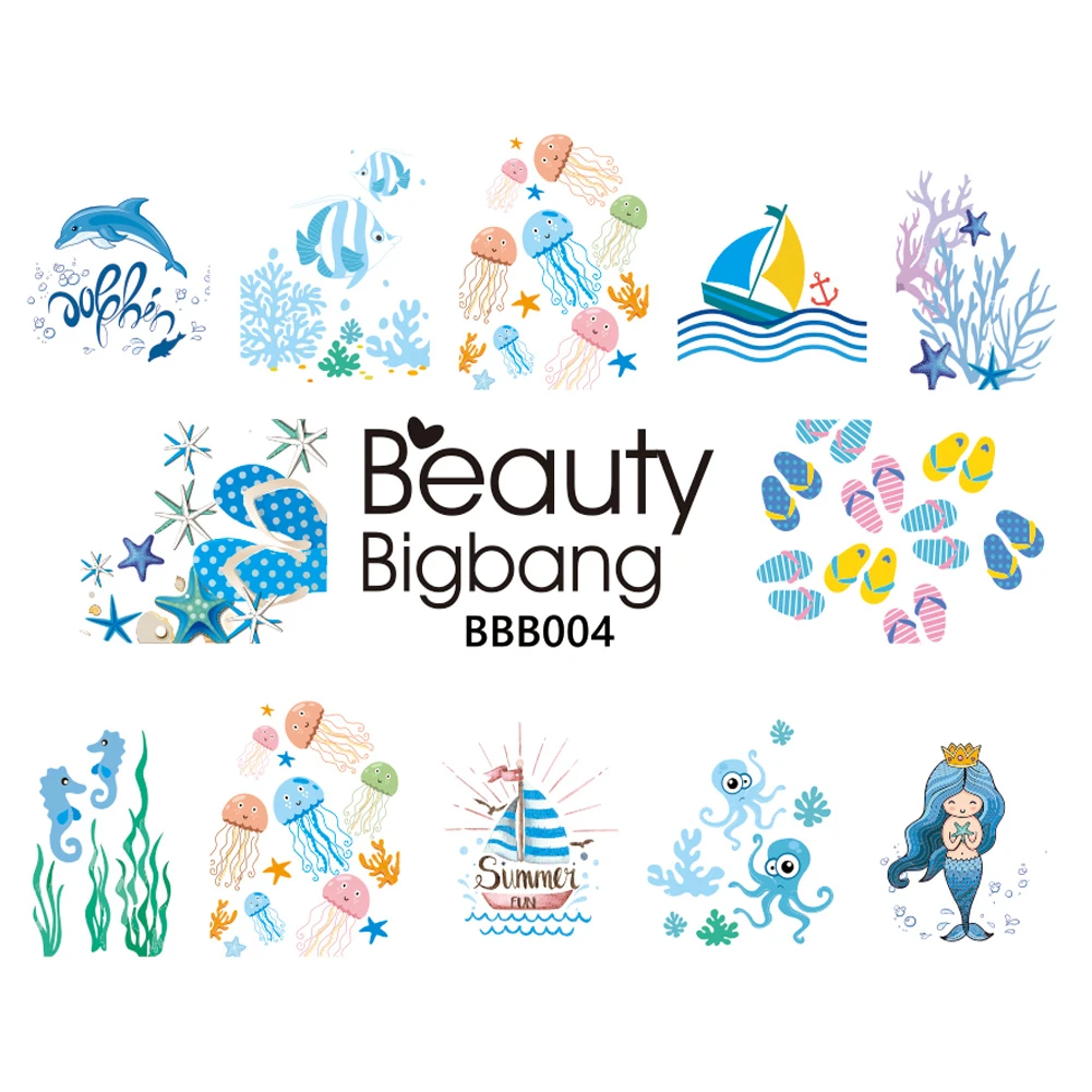 BEAUTYBIGBANG, 1 лист, лето, океан, дельфин, Русалка, растения, дизайн ногтей, переводные наклейки для ногтей, кончик для ногтей, наклейка для маникюра, Декор