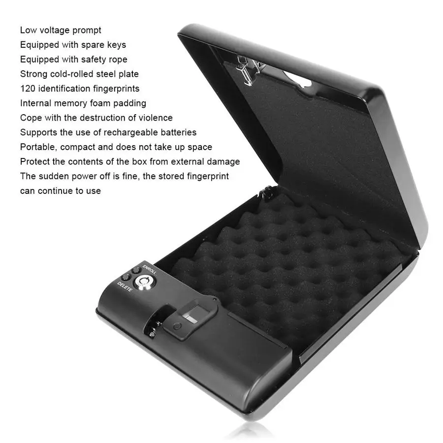 6. С прочной холоднокатаной стальной пластиной, каждый Сейф оснащен проволочной веревкой из нержавеющей стали и эластичной лентой, прокладка пены памяти в коробке, чтобы убедиться, что содержимое коробки не будет повреждено внешней силой.