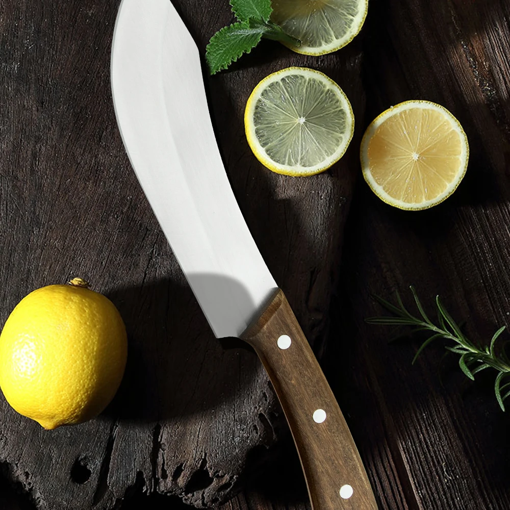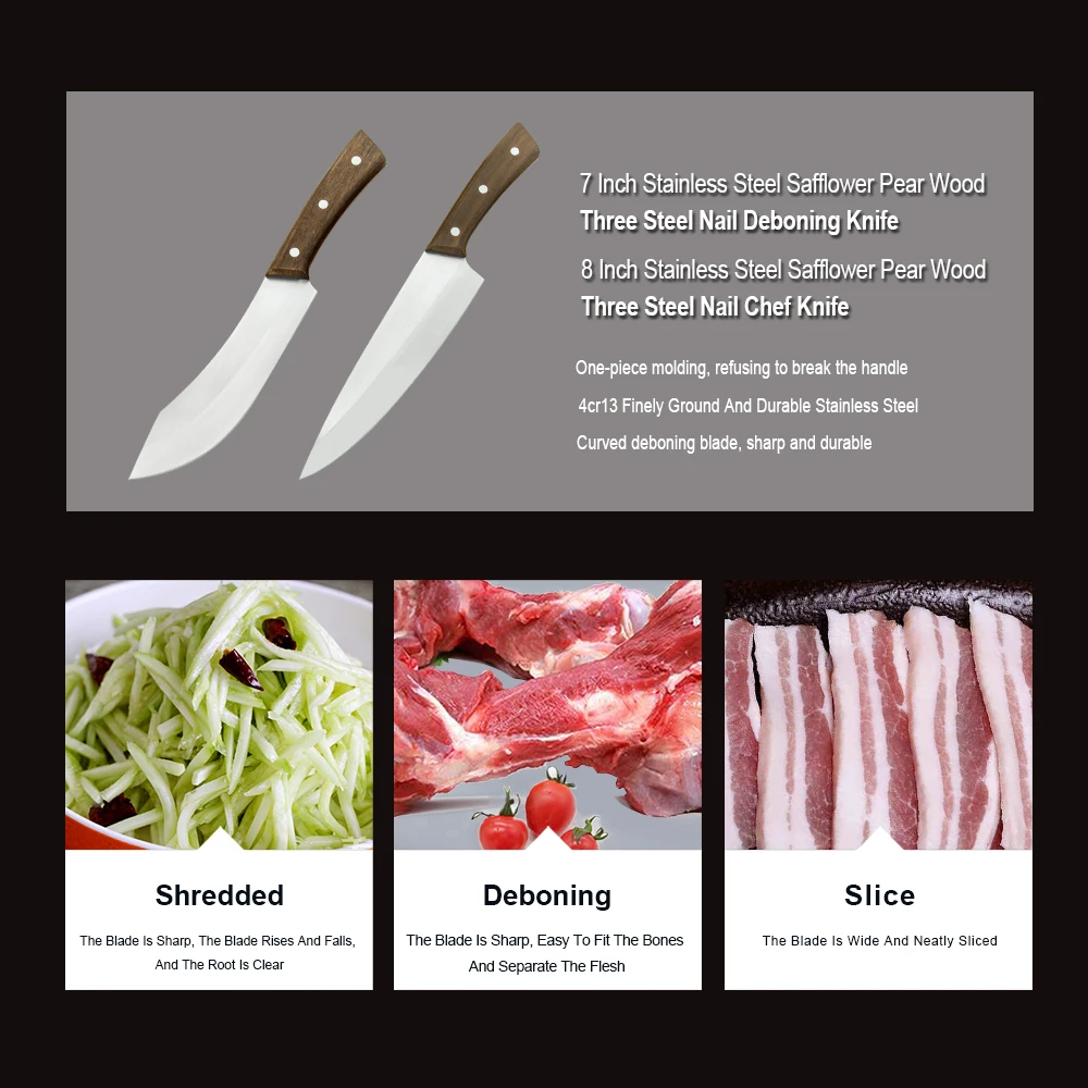 Тип ножа: 7 "скребок, 8" Кливер, 10 "нож для убоя Материал лезвия: высокоуглеродистая Нержавеющая сталь 4CR13 Сталь Материал ручки: розовое дерево