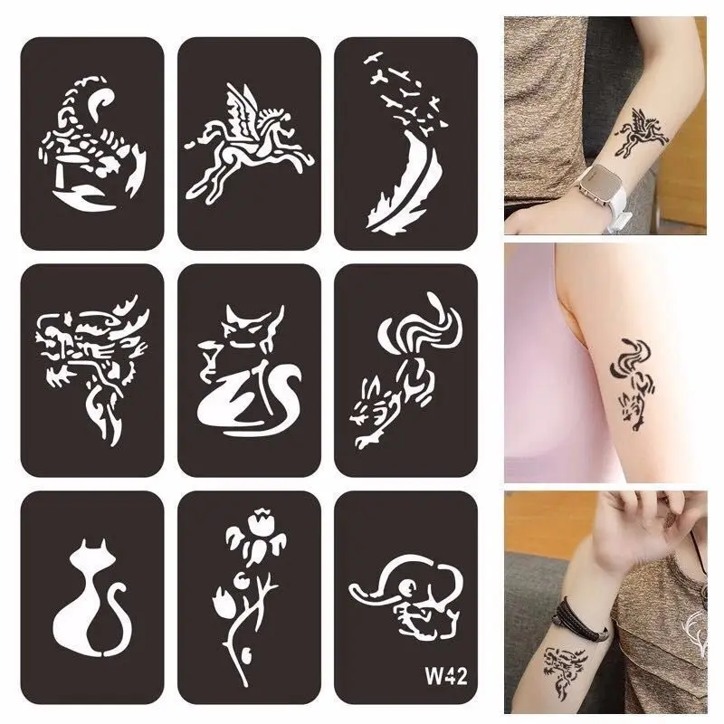 Прочный шаблон татуировки, прочный и долговечный. Если вы осторожны при использовании, их можно повторно использовать несколько раз. Съемная Татуировка-наклейки разных размеров. Он очень удобен в использовании, и его можно носить с собой после использования, не создавая путаницы и проблем!