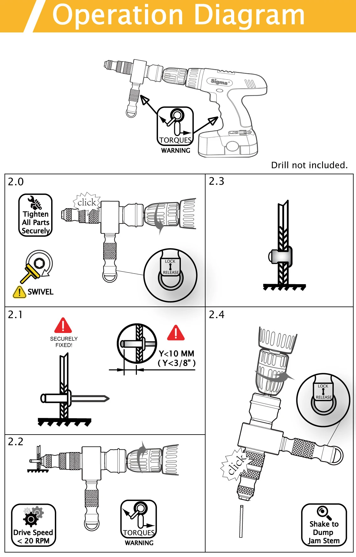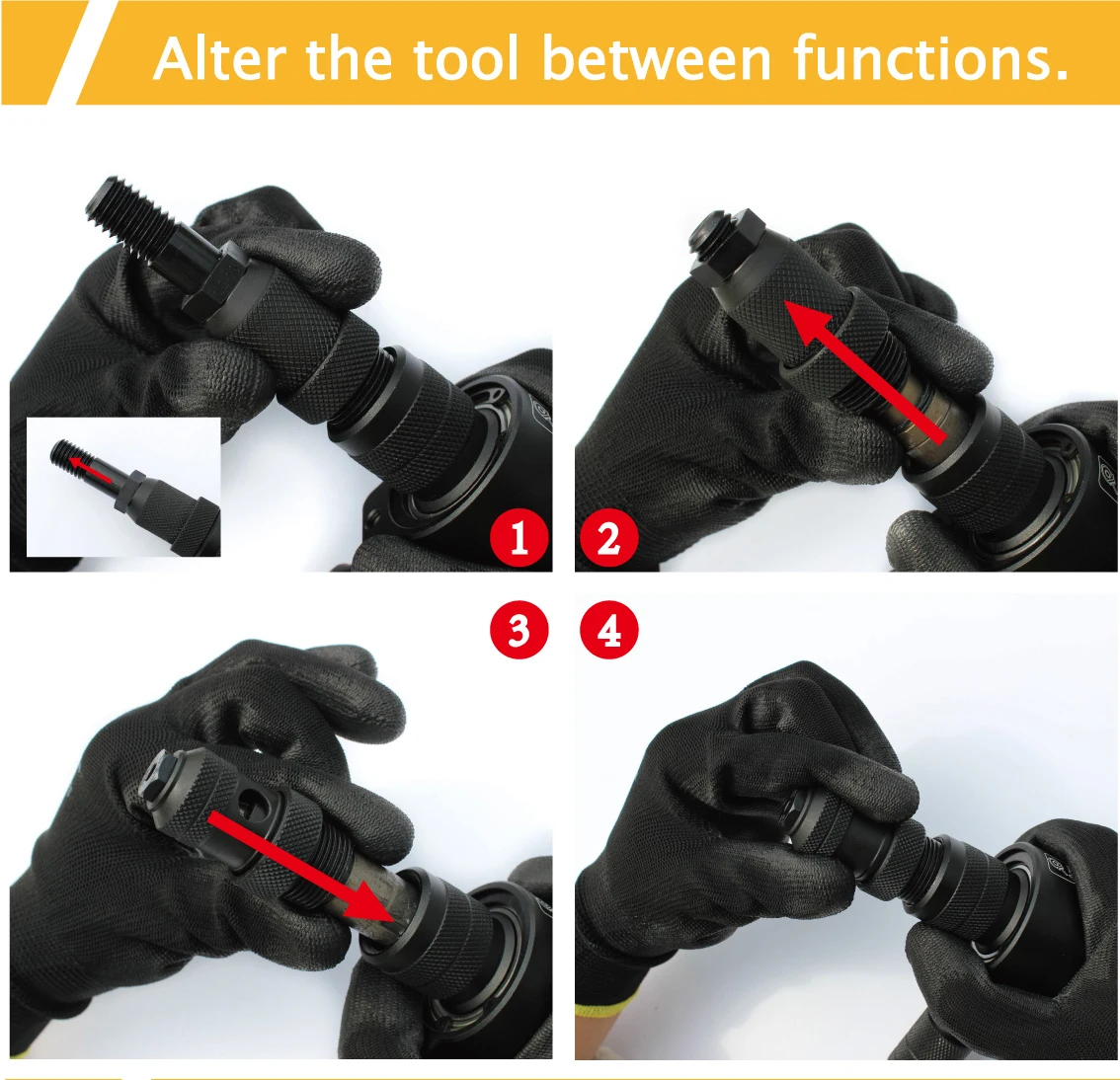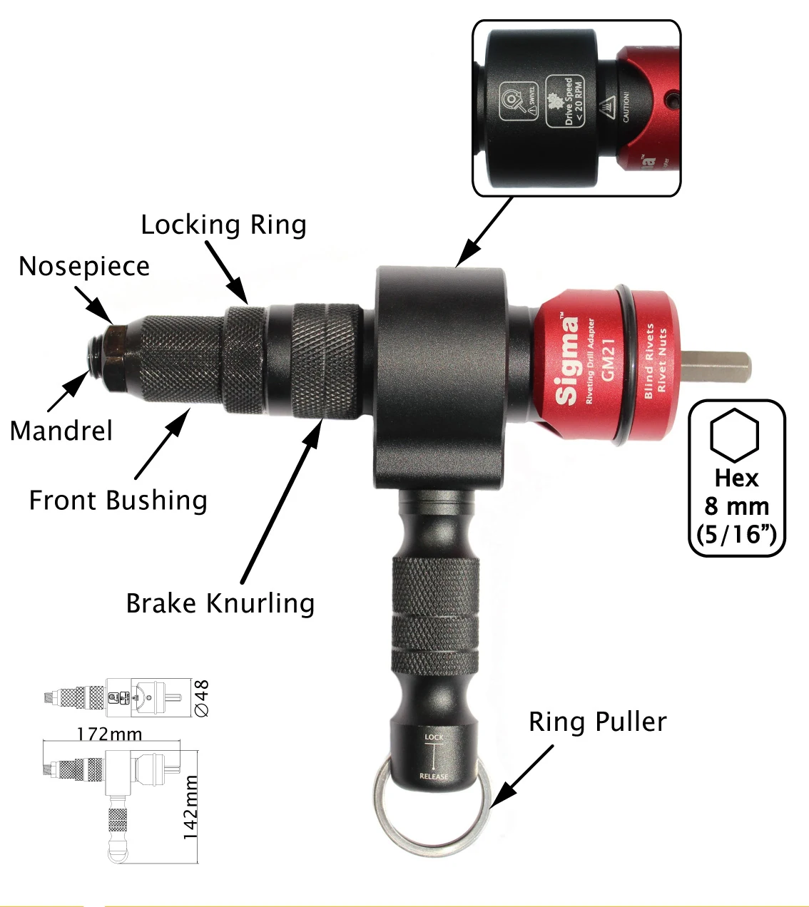 1. Шестигранный хвостовик 8 мм (5/16 ”) 2. Сверхмощный характеристики 2-в-1 для заклепок & гайка заклепки 3. Настройка до 6,4 мм структурные заклепки и M12 гайка заклепки 4. Отжимная конструкция улучшает герметичность крепления 5. Инженерная ручка шкафчика экономит огромные силы рук