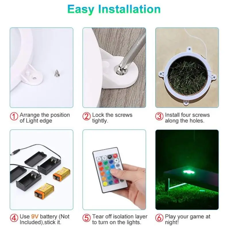 -Простота установки, 1/2 светодиодных ламп в упаковке. Простота в эксплуатации, просто нужно затянуть винты и вставить аккумулятор. С отверткой вы можете закончить его в течение 5 минут, просто ввинтите в каждый свет под отверстием вашей доски для кукурузного отверстия. Подходит для всех правил размер отверстия (внутренний диаметр 6 дюймов).