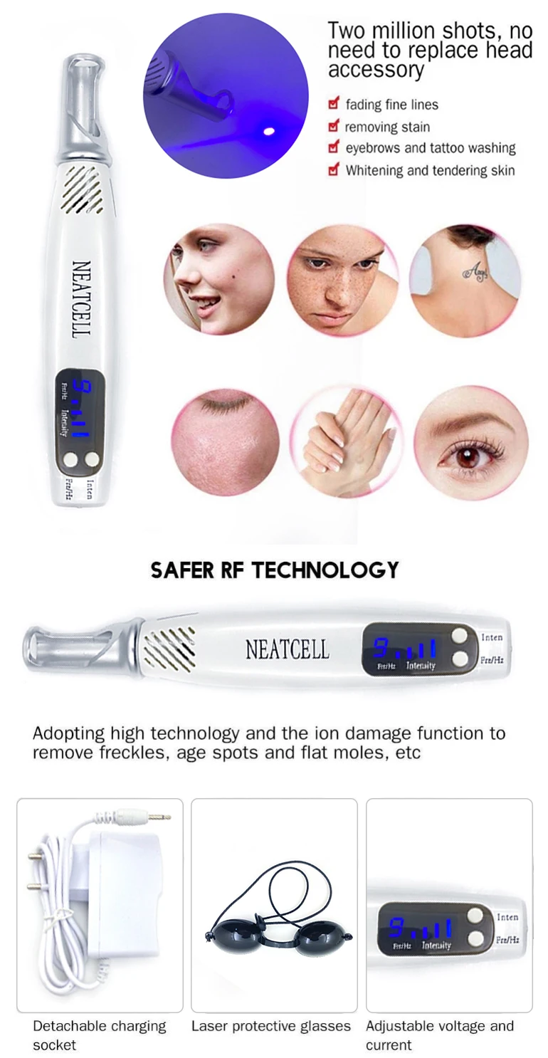 Это een picosecond laser pen ontworpen te behandelen soorten huidproblemen. Veilig en zonder schade aan de huid weefsel, deze pen kan u helpen verwijderen mol/acne, krimpen poriёn, verdunnen sproet/melanine, wassen tattoo/kbrauw tattoo etc. nauwkeuriger, hoeft alleen minder behandeling keer bereiken betere behandeling effecten. Набор Komen met huid reparatie: reparatie masker, gevriesdroogde, reparatie essentie, oplossen vloeistof en estie zal sterk verzorgen uw huid na gebruik van de laser pen.