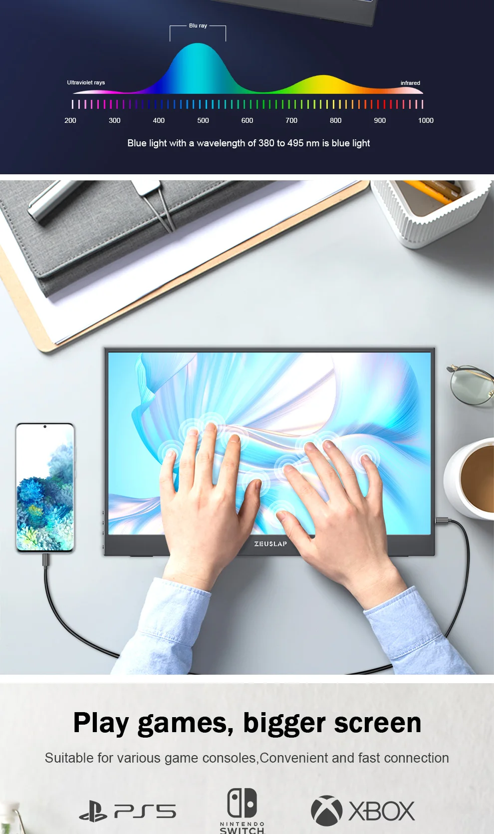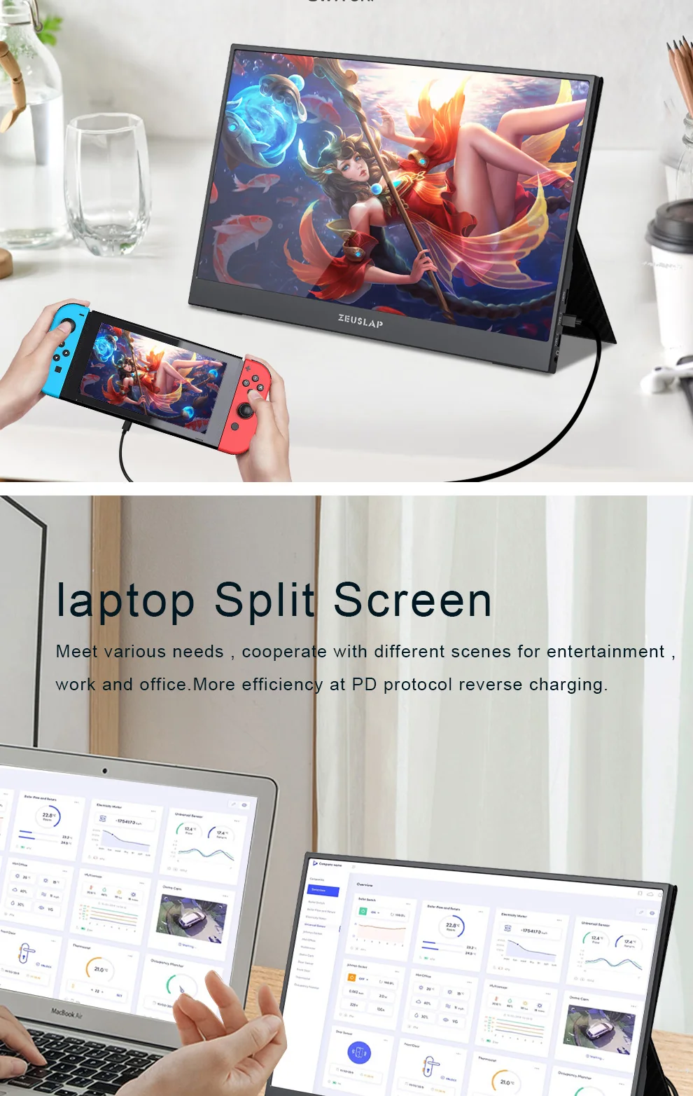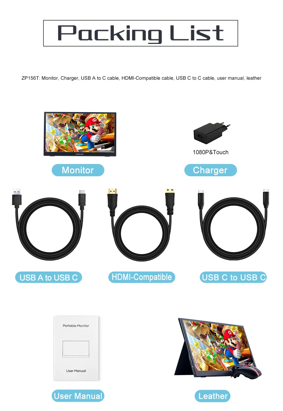 【Широкая Совместимость 】 zeuslap ZP156T портативный монитор легко подключается к ноутбуку, ПК, планшету, смартфонам, XBOX, PS4 /PS5, переключателям и т. д. через Type-C илиMini HDMI-совместимыйПорт, который обеспечивает стабильное соединение и стабильную передачу данных. Идеально подходит для деловых поездок, путешествий или семейного отдыха.