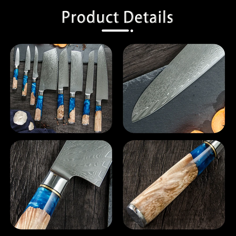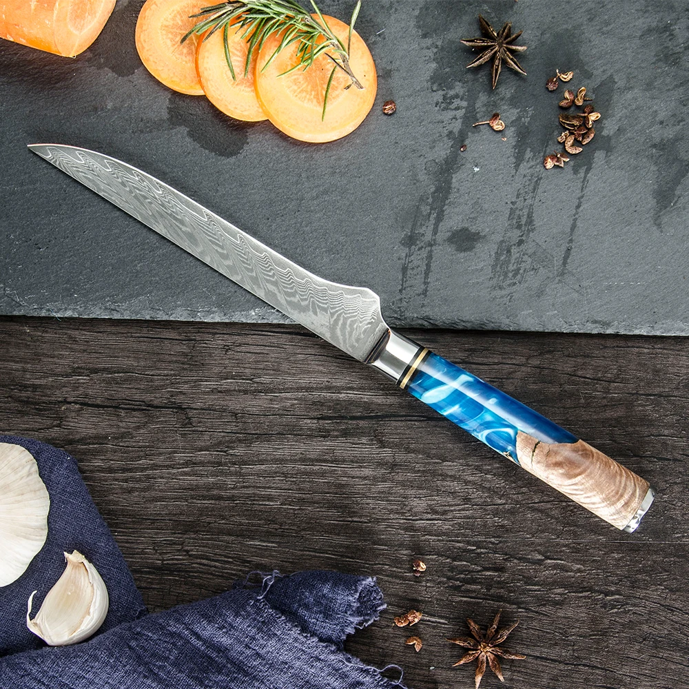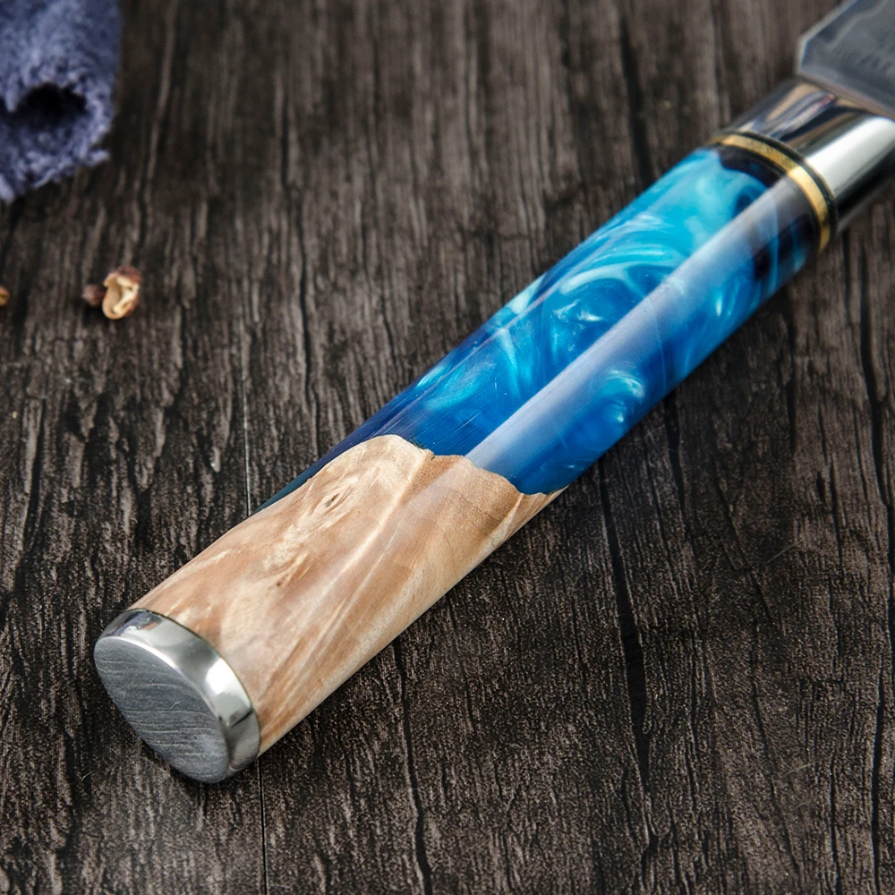 Хорошее качество дамасской стали нож и превосходное представление в резкости. Цветная деревянная ручка из смолы, очень красивая и приятный дизайн. Резка различных видов пищи, острый край, светильник, вес и удобный нож из нержавеющей стали. Идеально подходит для резки пищи с антипригарной эргономичной ручкой из АБС-пластика, что обеспечивает более сильное сцепление для предотвращения усталости рук.