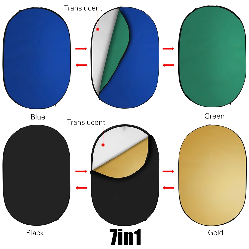 7-в-1 отражатель фотографии:Полупрозрачный, серебристый, золотой, белый, черный, зеленый и синий дизайн 7 в 1 отвечает вашим различным потребностям фотографии.