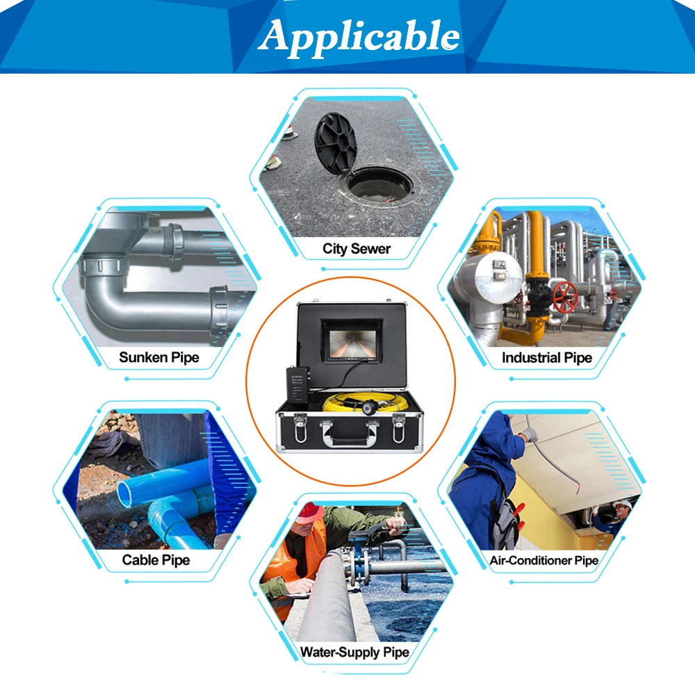 Этот продукт подходит для осмотра трубопровода, канализационных труб, воздуховодов, резервуаров, подводных и других темных условий, проверки внутренних трещин, коррозии, сварки, затычек и других необычных обстоятельств.