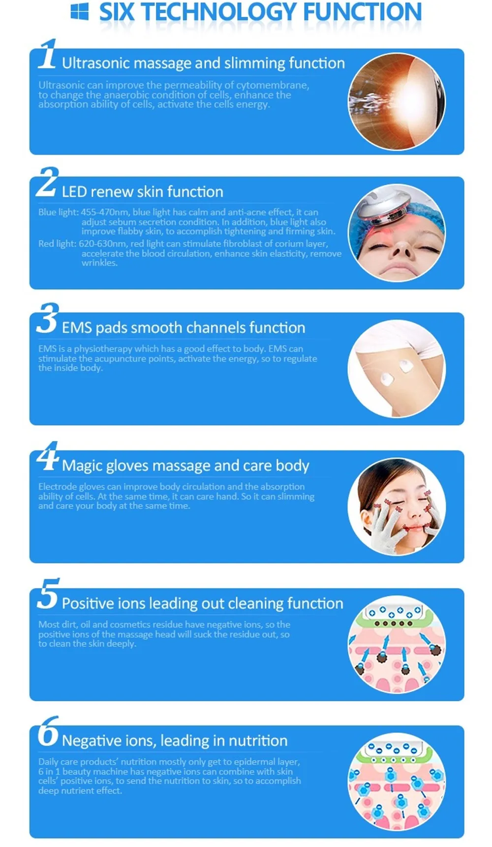 Продукты ежедневного ухода питание в основном доходит только до эпидермального слоя, косметический аппарат 6 в 1 имеет отрицательные ионы, можно комбинировать с положительными ионами клеток кожи, чтобы отправить питание коже, для достижения глубокого питательного эффекта.