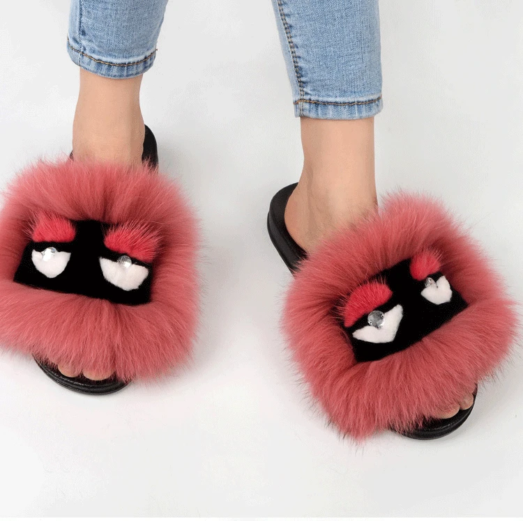 F.N.JACK Women Monster Fur Slippers Fluffy Real Fox Hair Sandals Plush Soft Flat Home Flip Flops Women Casual Cute Animal Shoe