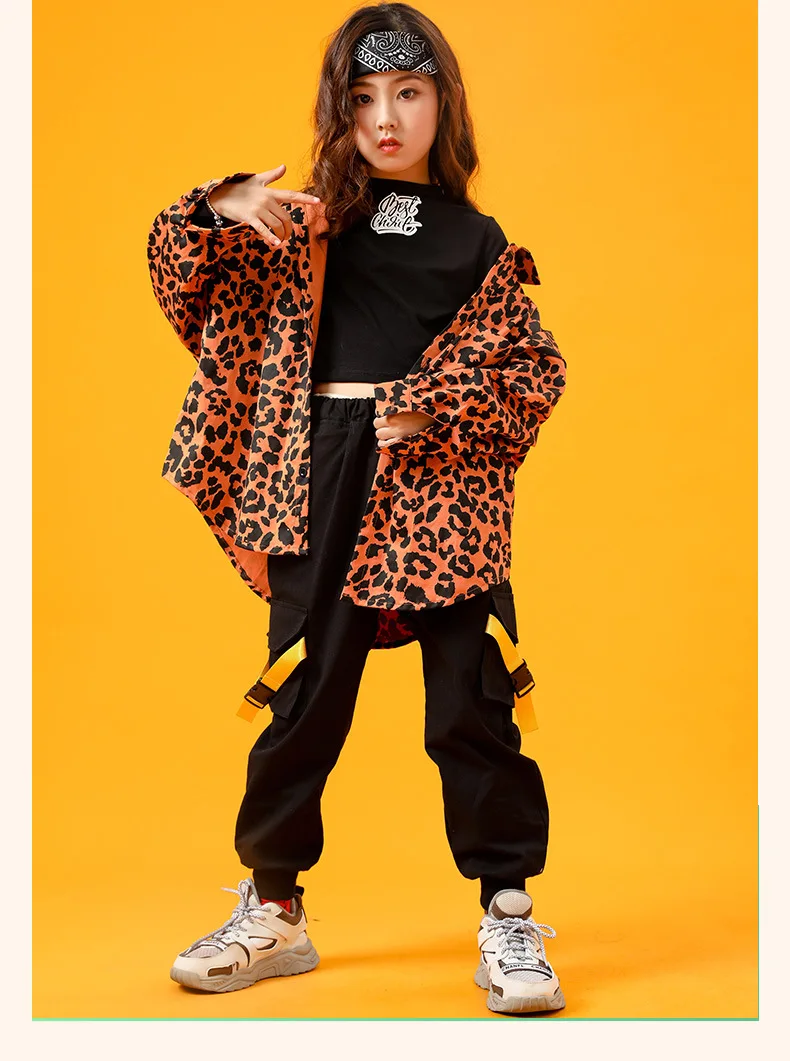 Детская одежда в стиле хип-хоп, рубашка большого размера с леопардовым принтом, черные уличные штаны-карго для девочек и мальчиков, танцевальный костюм, одежда, 2 предмета