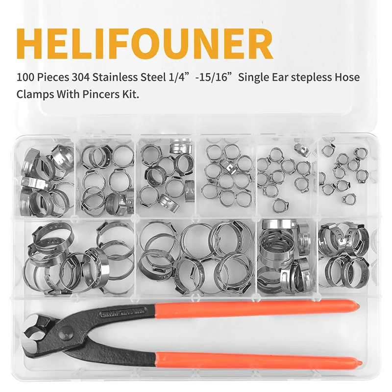 [Комплексные Размеры] этот набор зажимов для шлангов с одним ухом охватывает диапазон внутреннего диаметра 6-28,6 мм (10 общих размеров, 10 шт. для каждого размера): 6-7 мм, 7-8,7 мм, 8,8-10,5 мм, 10,3-12,8 мм, 12,8-15.m, 15,3-18,5 мм, 17,8-21,0 мм, 20,3-23,5 мм, 22,4-25,6 мм, 25-28,6 мм, которые широко используются в шлангах и пластиковых трубах, особенно подходит для напитков, Автомобильные, морские, мотоциклетные и промышленные приложения.