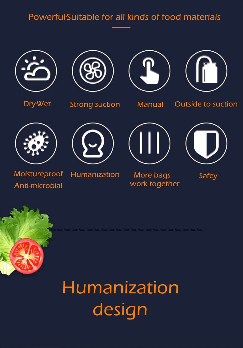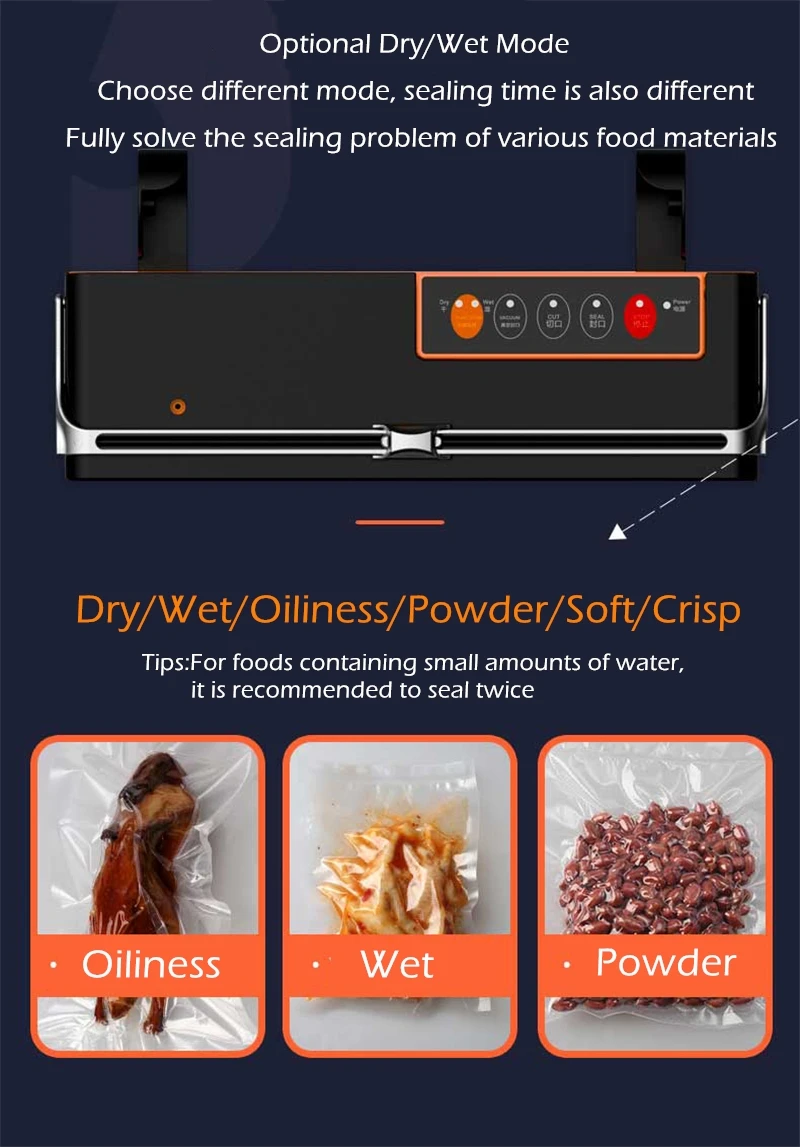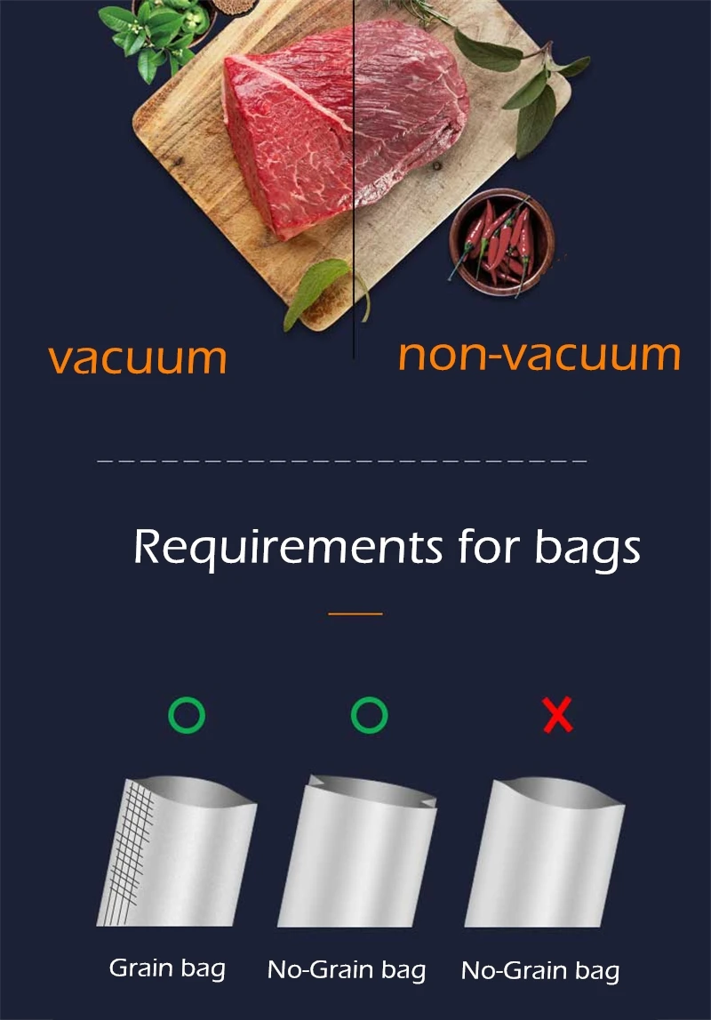 1. Машина не может вакуумно упаковывать жидкость в мешки, может вакуумно запечатывать влажную еду с небольшим количеством влаги. Для жидкости, можно положить их в контейнер, затем вакуум. 2. Машина должна использоваться со специальными мешками с линиями при вакуумной герметизации, для обычных мешков просто может быть запечатана.