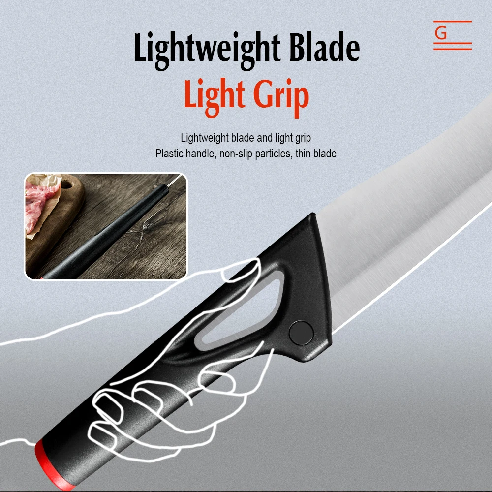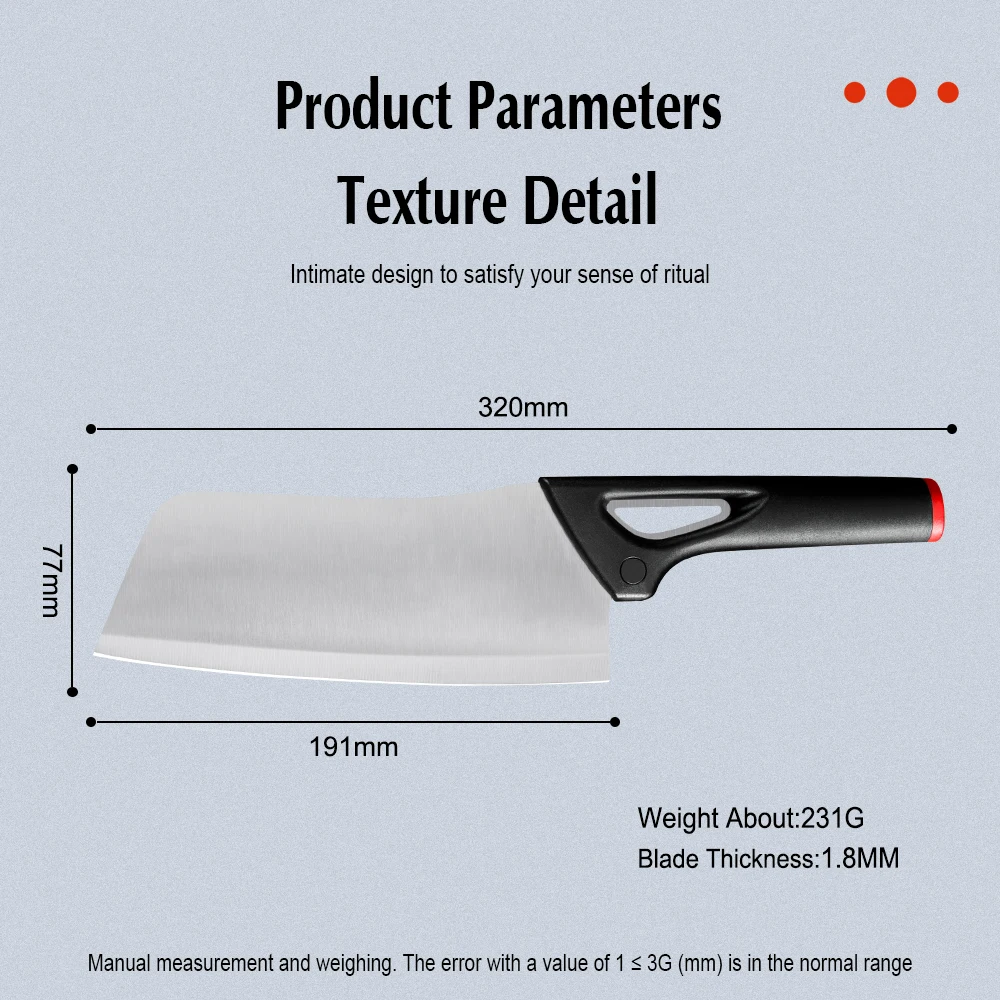 Материал: нержавеющая сталь Материал ручки: пластик Вес: около 425 г Характеристики: Razor Sharp для удобства рассечения мяса, овощей, фруктов и т. д. Ручка: удобные Пластик полой ручкой