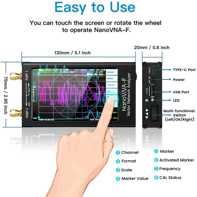 4,3-дюймовый пресс Sn показывает: NanoVNA-F с 4,3-дюймовым IPS TFT LCD и резистивным прессом sn, с большим углом обзора и может быть четко виден в сильный уличный светильник, который может измерять S-параметр, напряжение постоянного волнового соотношения SWR, фазовую карту, групповую задержку, график Смита, задержку, Полярный, линейный и так далее.