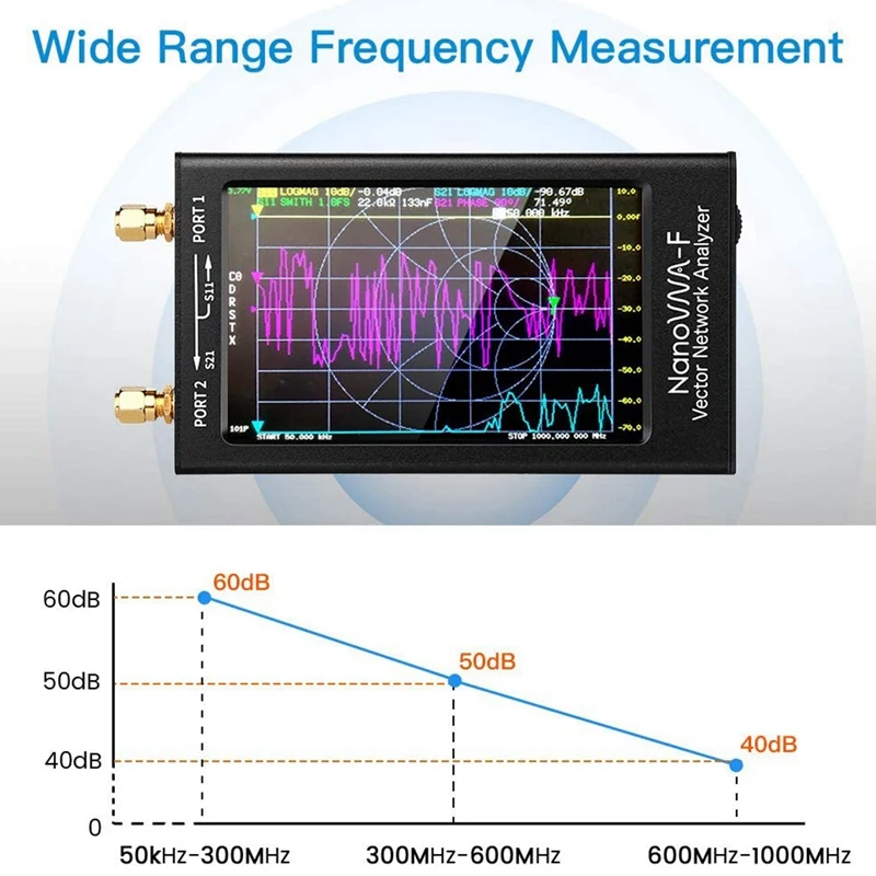 Большой диапазон измерения: Диапазон измерений NanoVNA-F составляет 50k-1 ГГц. Используйте гармонический чип часов SI5351 для измерения частоты до 1000 МГц. При частоте 600 м-1 ГГц S11 имеет динамический диапазон 40 дБ (отношение стоящей волны составляет менее 1,02).