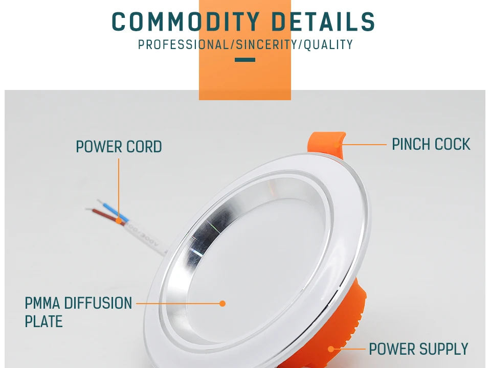 Name:LED Downlight Material:Alumium+pc Voltage:AC220V Wattage:5W Lighting Source:LED Emitting color:White/Warm White/&Natural White Body Color:White+Silver, White+Gold Size:96mm Opening Size:70-85mm Net Weight:70g Gross Weight:103g Product Size:98*115*42mm Packing Size:95*96*100mm Feature:Cambered surface dimmer downlight, tri-color changeable, Ultra thin 2.5inch