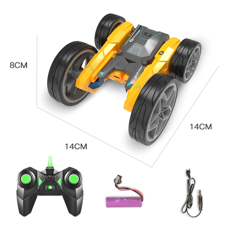 Товар: двухбоковая машина для трюков Цвет: желтый/красный Автомобильная батарея: 3,7 V 500mAh перезаряжаемая литиевая батарея Батарея дистанционного управления: 2 * "AAA" батареи (не входят в комплект) Регулятор частоты: 2,4 ГГц Расстояние дистанционного управления: от 30 до 50 метров Материал: пластик и электрические компоненты Размер изделия: 14*14*8 см Размер упаковки: 17*9*27 см