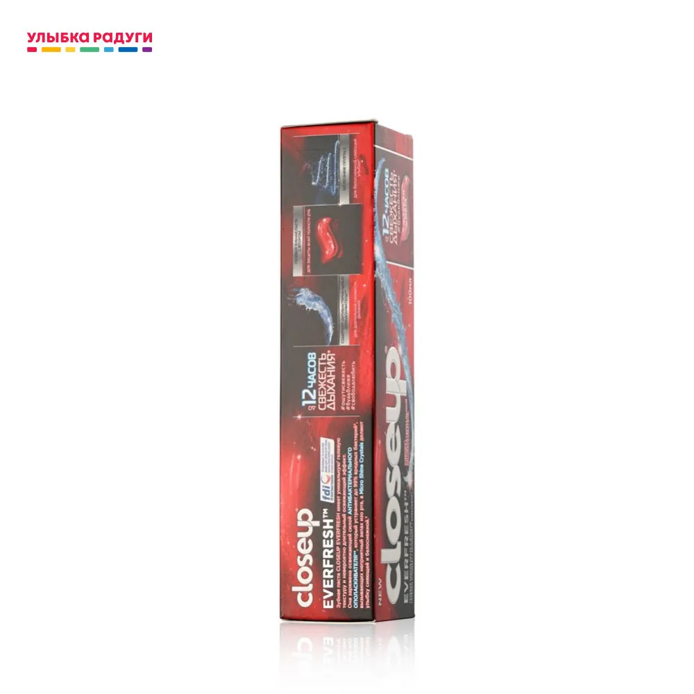 Гелевая зубная паста CLOSEUP EVERFRESH обеспечивает освежающий эффект до 12 часов. Зубная паста заряжена освежающей силой антибактериального ополаскивателя, который устраняет до 99% вредных бактерий, вызывающих неприятный запах изо рта, что позволяет надолго сохранить дыхание свежим. Освежающий эффект зубной пасты подтвержден клиническими исследованиями. Зубная паста CLOSEUP EVERFRESH жаркая мята имеет уникальную гелевую текстуру насыщенного красного цвета с перламутровыми частичками. Содержит фтор для эффективной защиты от кариеса и защиты всей полости рта. Кроме того, она бережно и тщательно очищает эмаль за счет абразива - диоксида кремния (Silica). Диоксид кремния имеет округлую форму частиц и не травмирует эмаль в процессе чистки зубов, при этом позволяет добиться равномерного удаления налета по всей поверхности зубов. Зубная паста содержит специальные компоненты Micro Shine Crystals, которые способствуют отбеливанию эмали, делая вашу улыбку сияющей и белоснежной.